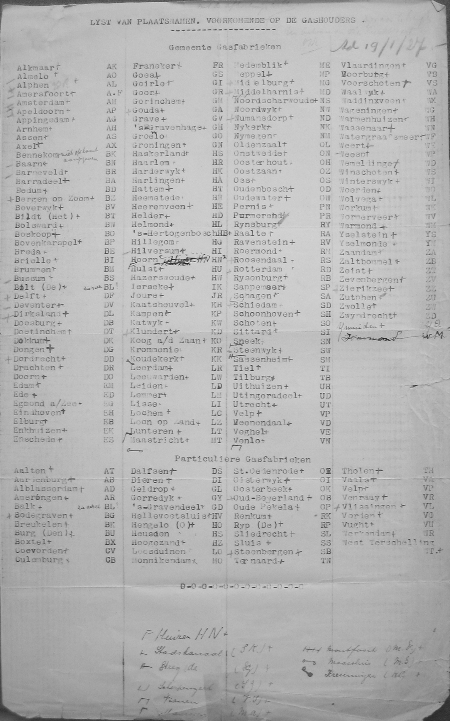 Lijst met markeringen op gashouders januari 1927