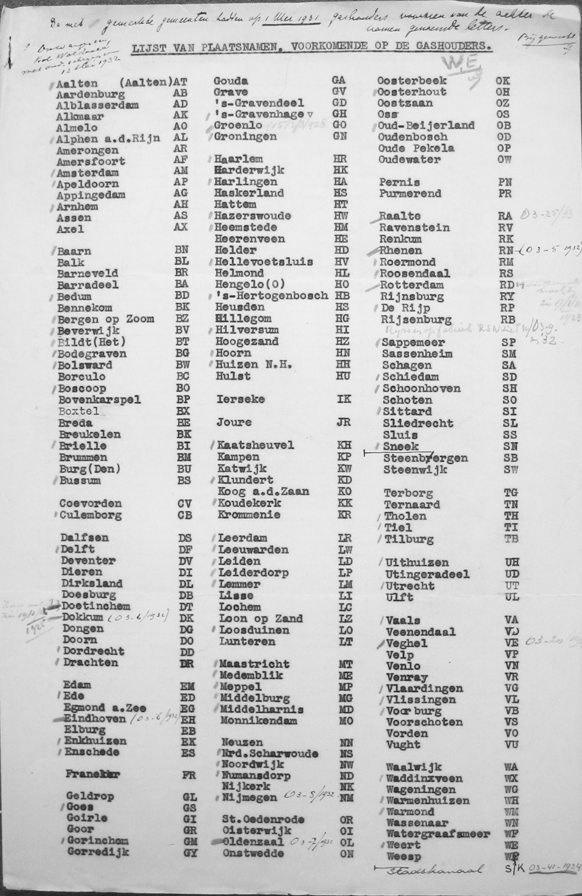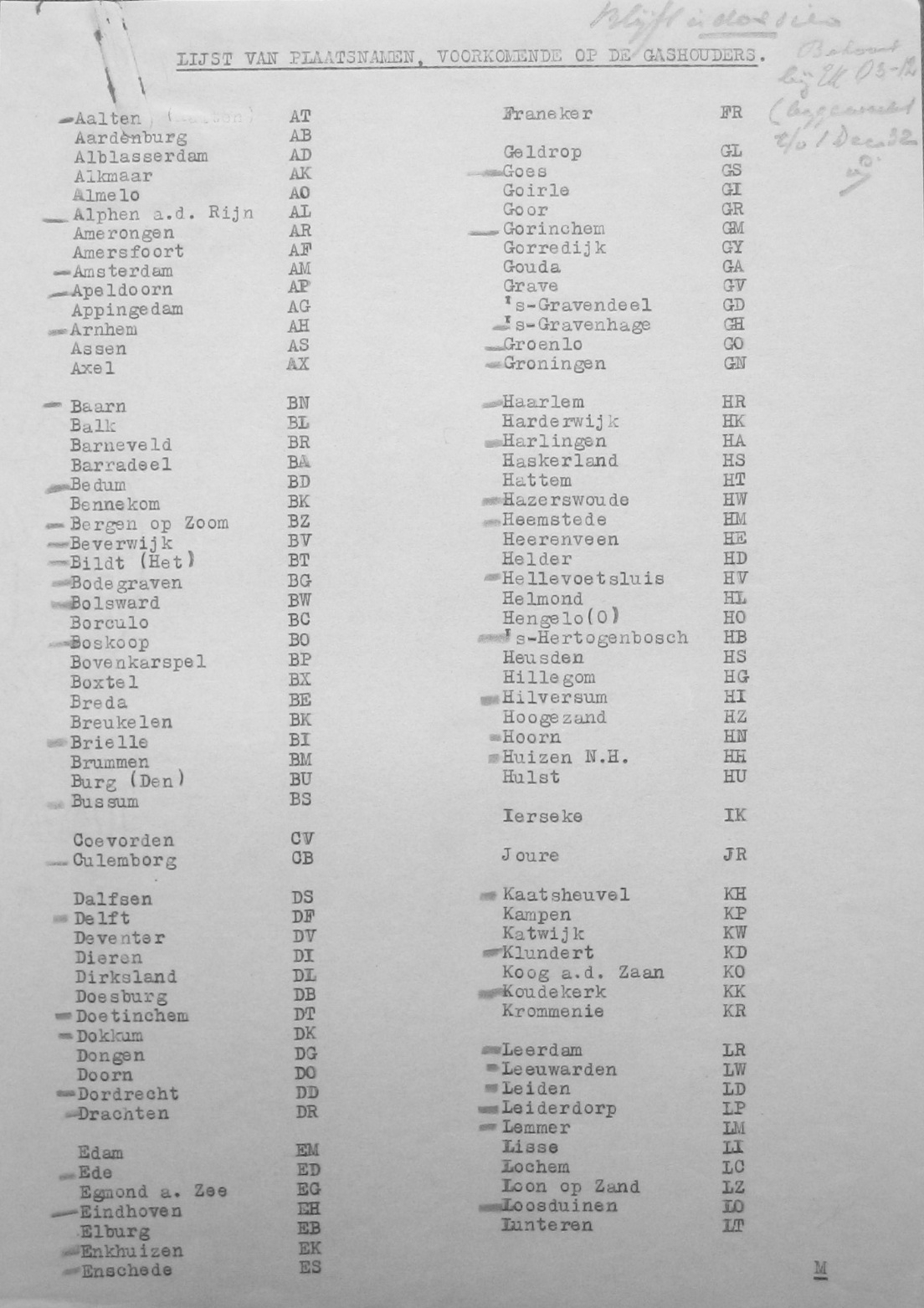 Lijst met markeringen op gashouders december 1932 (uit: Nationaal Archief)