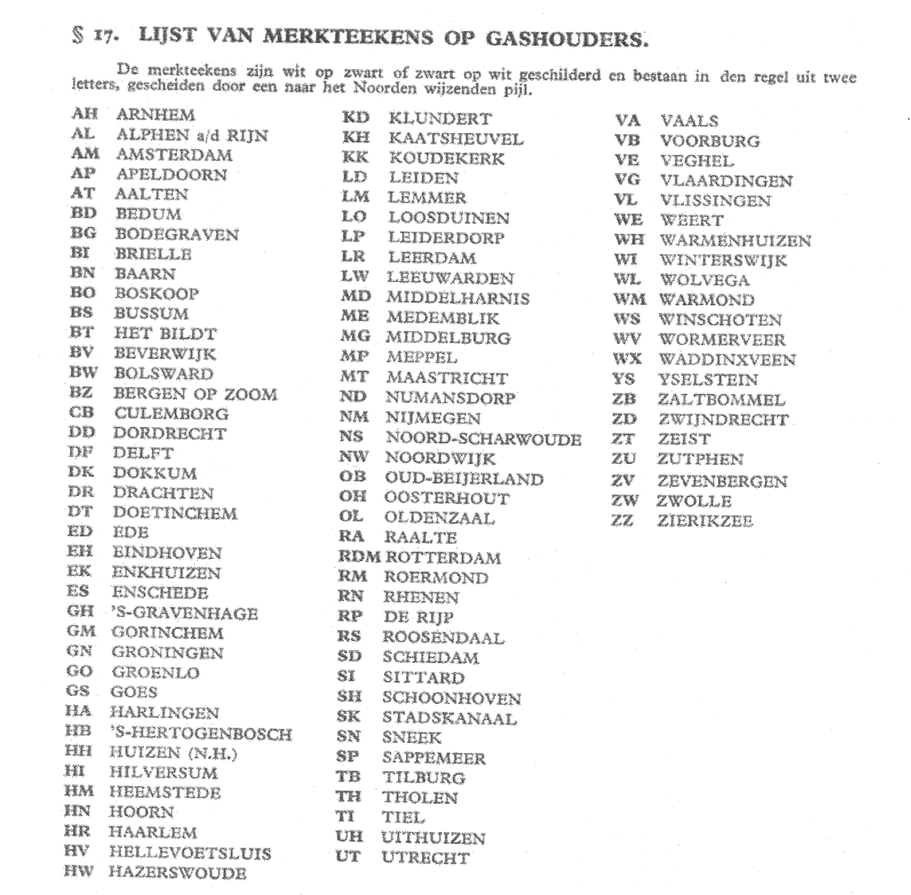 Lijst met markeringen op gashouders 1938, zoals gepubliceerd in de "Gids voor Luchtvarenden"